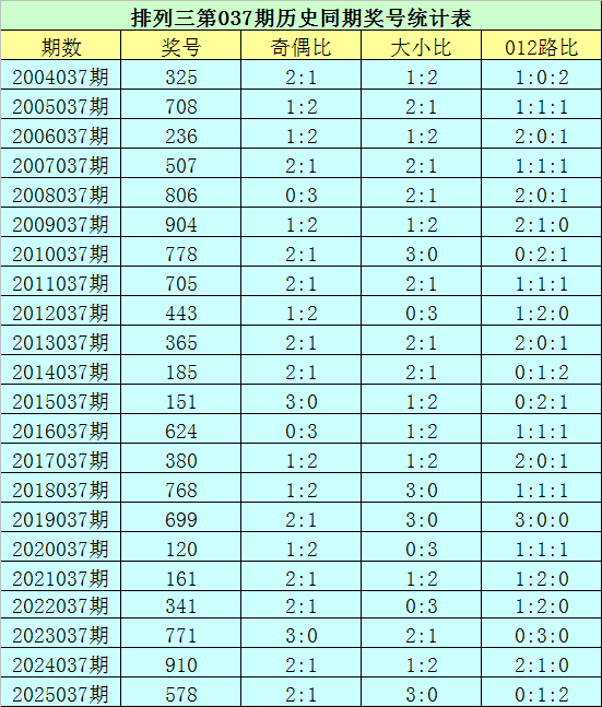 排列三第2026037期开奖日期:2026年2月6日,历史上第037期已开出了22次奖号,历年同期号码分别为:325、708、236、507、806、904、778、705、443、365、185、151、624、380、768、699、120、161、341、771、910、578。