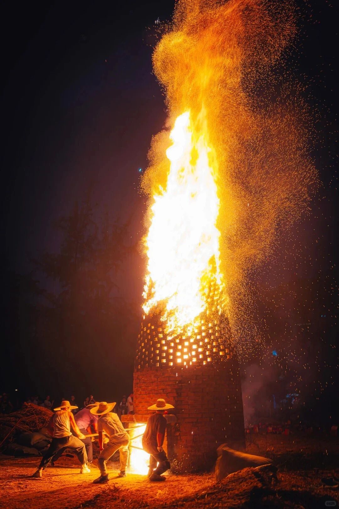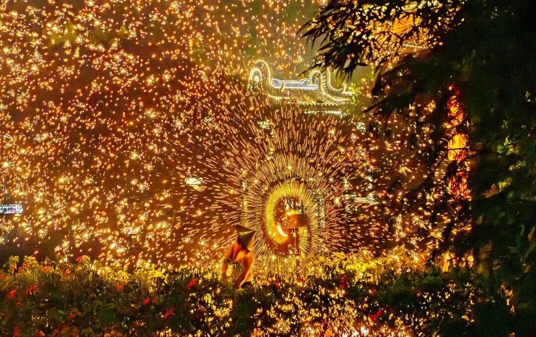 夜幕降临, “火舞星河” 系列演出将夜空点燃。打铁花如银河倾泻,火壶、飞天凤凰等表演次第绽放,场面震撼。